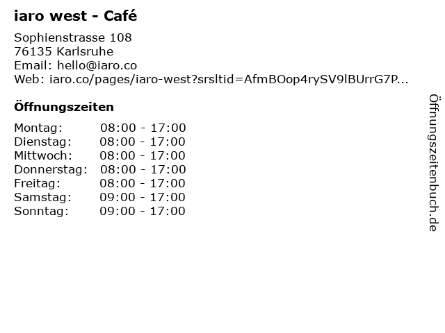 | Öffnungszeiten iaro west - Café in Karlsruhe anzeigen | |