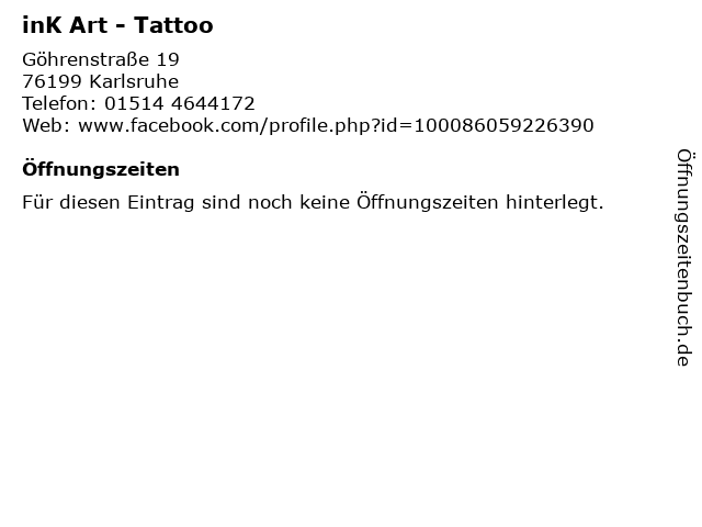 | Öffnungszeiten inK Art - Tattoo in Karlsruhe anzeigen | |