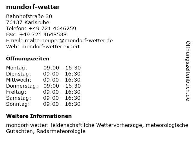 | Öffnungszeiten mondorf-wetter in Karlsruhe anzeigen | |