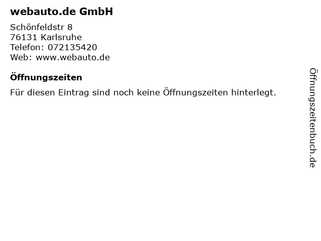 | Öffnungszeiten webauto.de GmbH in Karlsruhe anzeigen | |