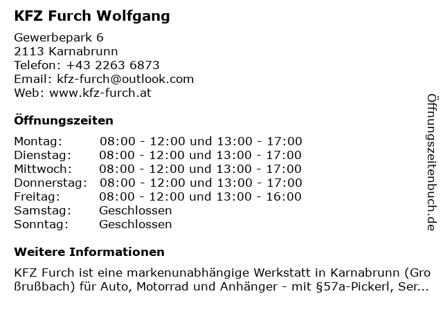 | Öffnungszeiten KFZ Furch Wolfgang in Karnabrunn anzeigen | |