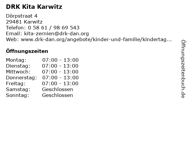 | Öffnungszeiten DRK Kita Karwitz in Karwitz anzeigen | |