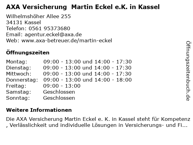 2 AXA Versicherung - Hauptvertretung Axel Seeliger (Entfernung: 1,41 km) Harleshäuser Str. 45, 34130 Kassel 6 AXA Versicherung - Hauptvertretung Bianca Löwe (Entfernung: 3,83 km) Rheinstahlring 53, 34246 Vellmar |