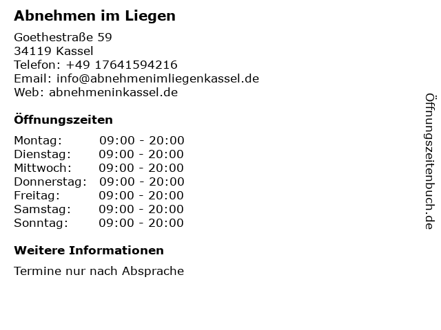 | Öffnungszeiten Abnehmen im Liegen in Kassel anzeigen | |