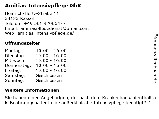 | Öffnungszeiten Amitias Intensivpflege GbR in Kassel anzeigen | |