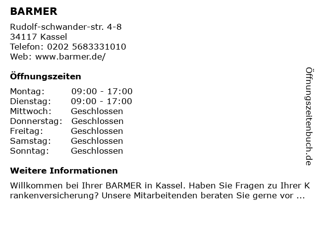 Hinweis: Willkommen bei Ihrer BARMER in Kassel. Haben Sie Fragen zu Ihrer Krankenversicherung? Unsere Mitarbeitenden beraten Sie gerne vor Ort oder nutzen Sie jederzeit unseren Online-Service.