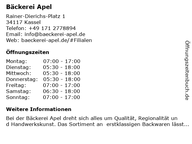 | Öffnungszeiten Bäckerei Apel in Kassel anzeigen | |