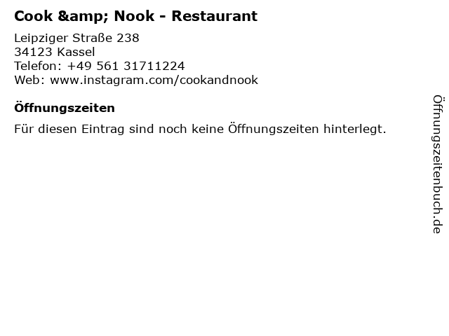 | Öffnungszeiten Cook & Nook - Restaurant in Kassel anzeigen | |