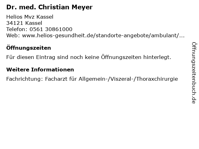 | Öffnungszeiten Dr. med. Christian Meyer in Kassel anzeigen | |
