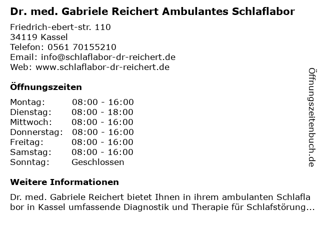 1 Dr. med. Gabriele Reichert Ärztin f. Physikalische Medizin (Entfernung: 0,01 km) Friedrich-Ebert-Straße 110, 34119 Kassel 3 6 |