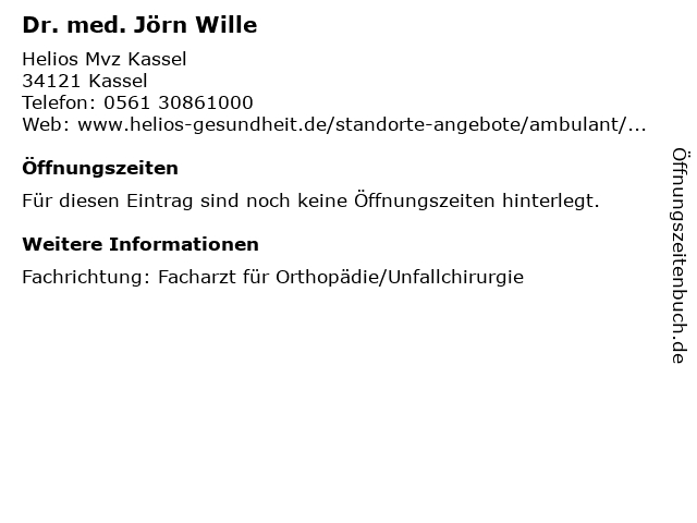 | Öffnungszeiten Dr. med. Jörn Wille in Kassel anzeigen | |