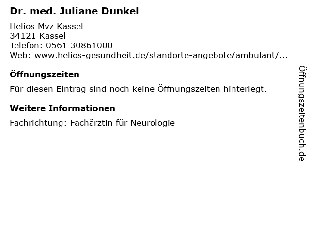 | Öffnungszeiten Dr. med. Juliane Dunkel in Kassel anzeigen | |
