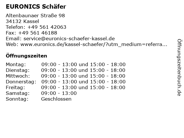 | Öffnungszeiten EURONICS Schäfer in Kassel anzeigen | |