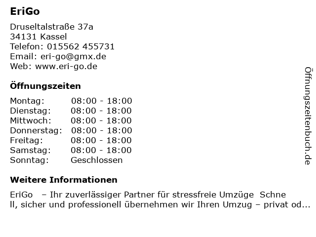 | Öffnungszeiten EriGo in Kassel anzeigen | |