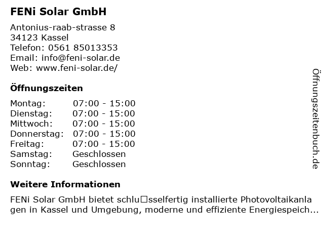 | Öffnungszeiten FENi Solar GmbH in Kassel anzeigen | |