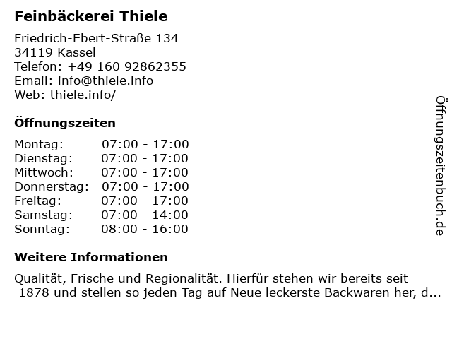 | Öffnungszeiten Feinbäckerei Thiele in Kassel anzeigen | |