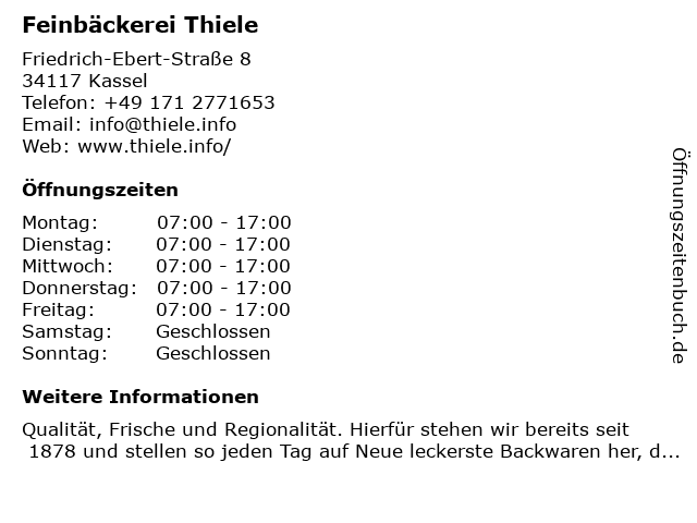 | Öffnungszeiten Feinbäckerei Thiele in Kassel anzeigen | |