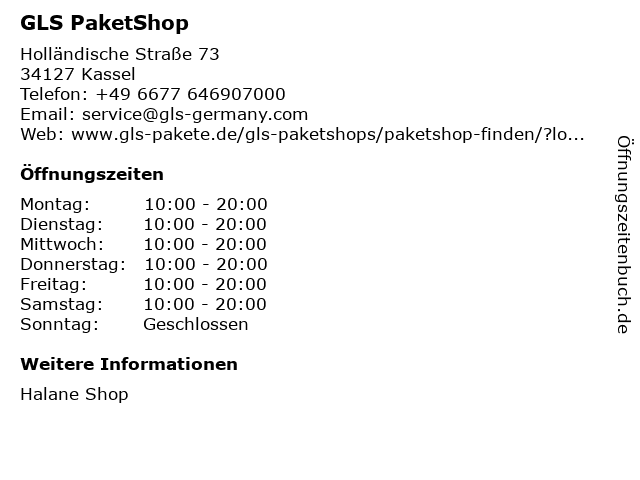 | Öffnungszeiten GLS PaketShop in Kassel anzeigen | |