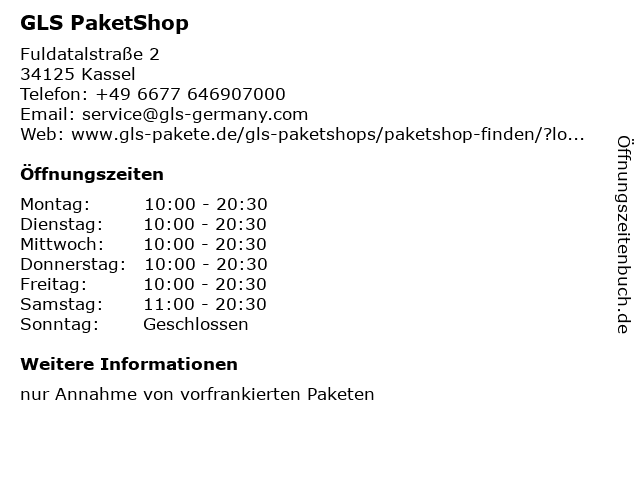 | Öffnungszeiten GLS PaketShop in Kassel anzeigen | |