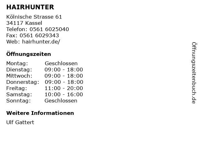 | Öffnungszeiten HAIRHUNTER in Kassel anzeigen | |