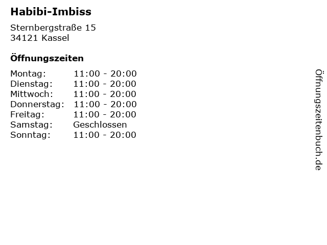 | Öffnungszeiten Habibi-Imbiss in Kassel anzeigen | |