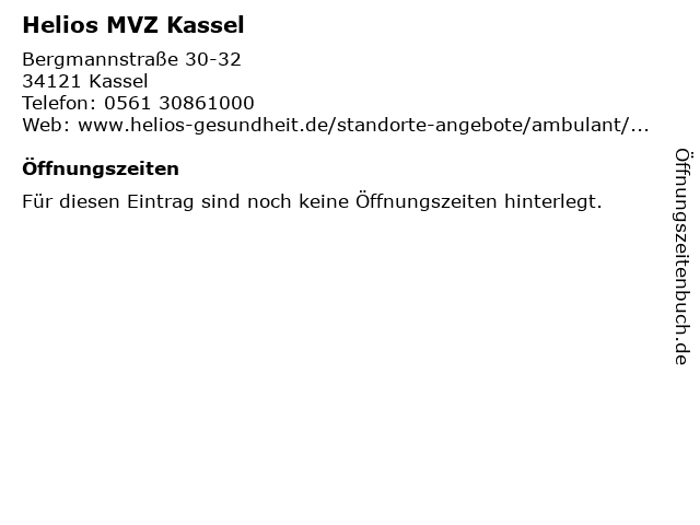 | Öffnungszeiten Helios MVZ Kassel in Kassel anzeigen | |