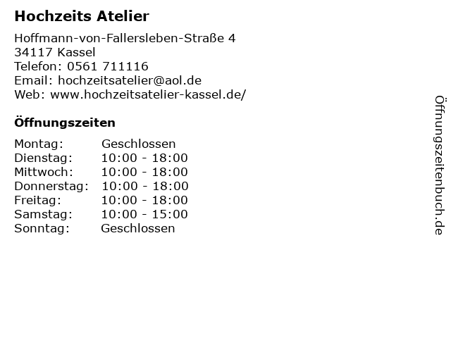 | Öffnungszeiten Hochzeits Atelier in Kassel anzeigen | |
