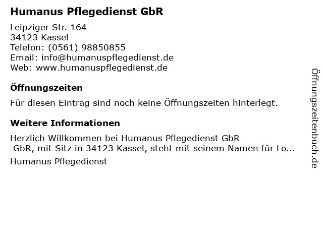| Öffnungszeiten Humanus Pflegedienst GbR in Kassel anzeigen | |