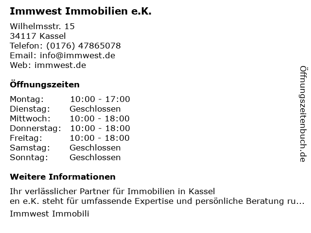 | Öffnungszeiten Immwest Immobilien e.K. in Kassel anzeigen | |