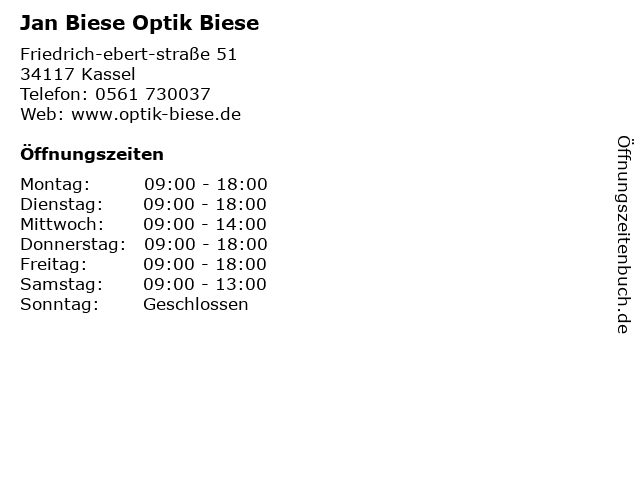 | Öffnungszeiten Jan Biese Optik Biese in Kassel anzeigen | |