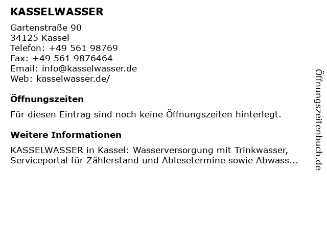 | Öffnungszeiten KASSELWASSER in Kassel anzeigen | |