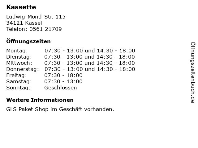 | Öffnungszeiten Kassette in Kassel anzeigen | |