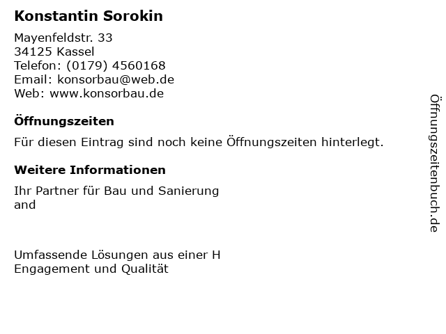 | Öffnungszeiten Konstantin Sorokin in Kassel anzeigen | |