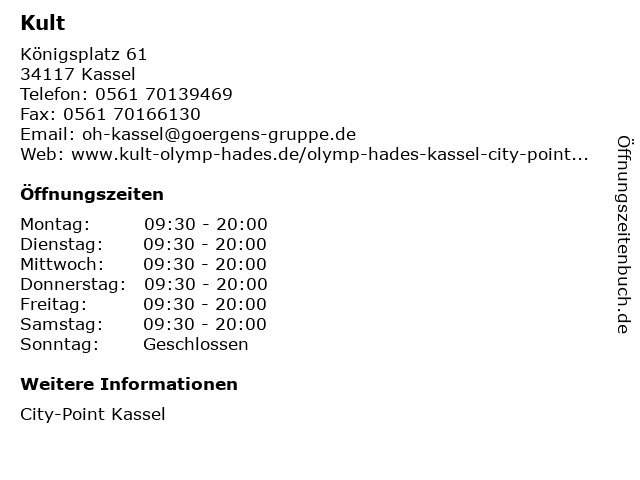 | Öffnungszeiten Kult in Kassel anzeigen | |