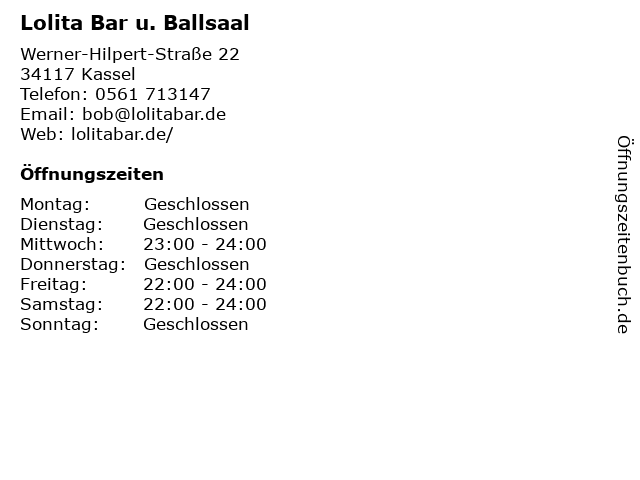 | Öffnungszeiten Lolita Bar u. Ballsaal in Kassel anzeigen | |