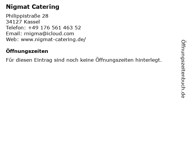 | Öffnungszeiten Nigmat Catering in Kassel anzeigen | |
