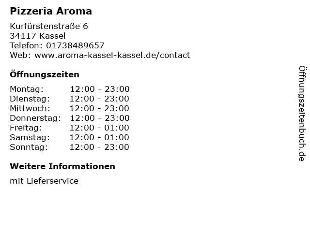 | Öffnungszeiten Pizzeria Aroma in Kassel anzeigen | |
