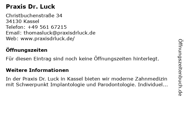 | Öffnungszeiten Praxis Dr. Luck in Kassel anzeigen | |
