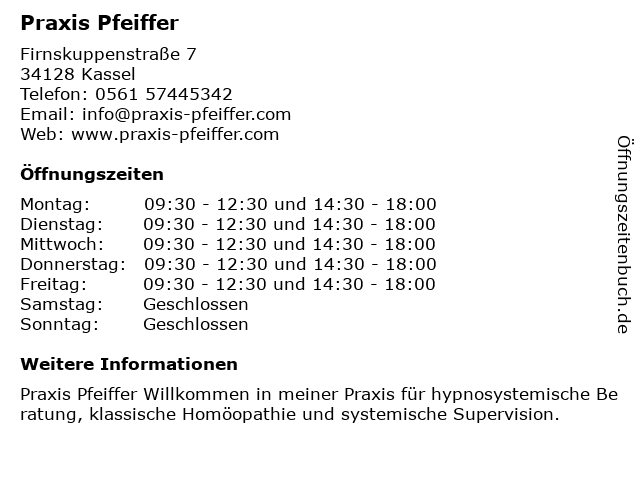 | Öffnungszeiten Praxis Pfeiffer in Kassel anzeigen | |