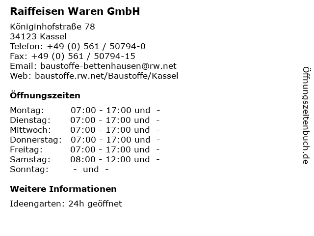 | Öffnungszeiten Raiffeisen Waren GmbH in Kassel anzeigen | |