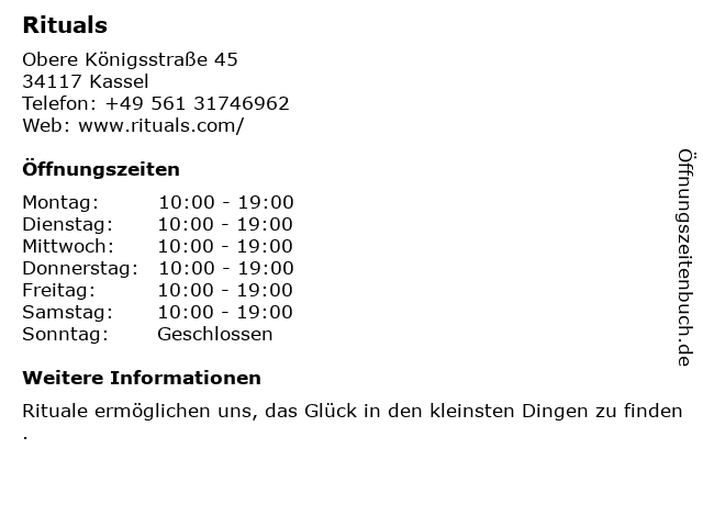 | Öffnungszeiten Rituals in Kassel anzeigen | |