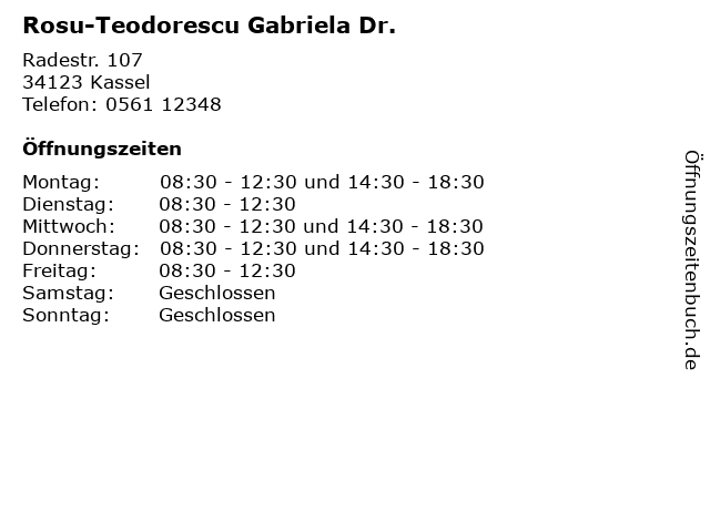 | Telefonnummer Rosu-Teodorescu Gabriela Dr. in Kassel (0561 12348) anrufen | |