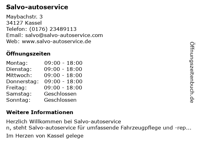 | Öffnungszeiten Salvo-autoservice in Kassel anzeigen | |