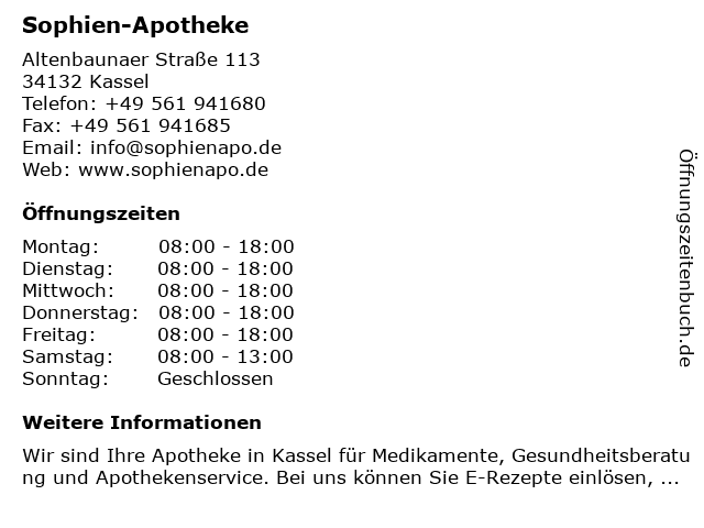 | Öffnungszeiten Sophien-Apotheke in Kassel anzeigen | |