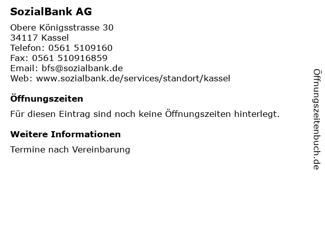 | Öffnungszeiten SozialBank AG in Kassel anzeigen | |