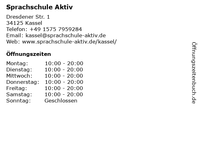 | Öffnungszeiten Sprachschule Aktiv in Kassel anzeigen | |