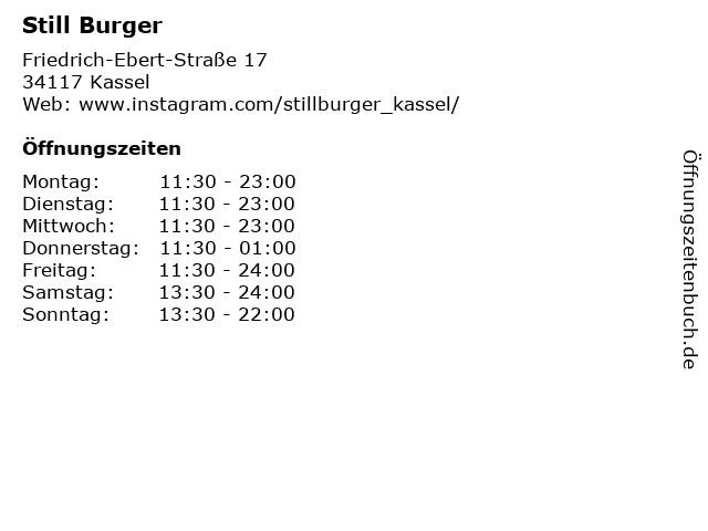 | Öffnungszeiten Still Burger in Kassel anzeigen | |