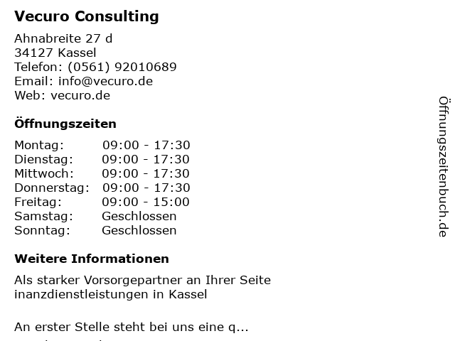 | Öffnungszeiten Vecuro Consulting in Kassel anzeigen | |