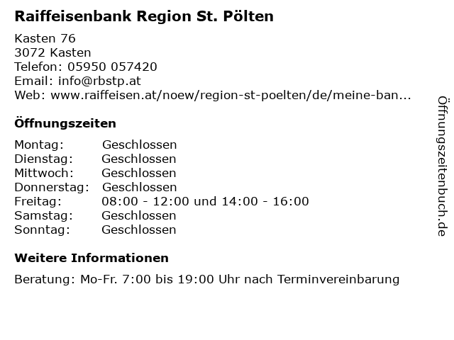 6 Raiffeisenbank Region St. Pölten - (Bankomat Bankstelle) (Entfernung: 0,00 km) Kasten 76, 3072 Kasten |