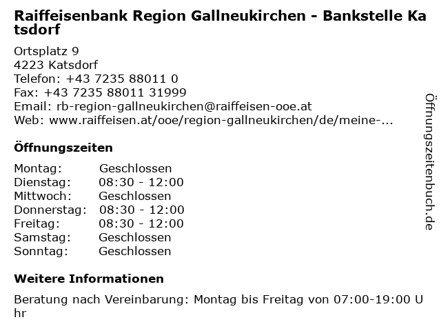 Branchen & Suchbegriffe zu Raiffeisenbank Region Gallneukirchen - Bankstelle Katsdorf:abheben, aktien, bankstelle, beratung, devisen, finanzen, gallneukirchen, geld wechseln, geldautomat, katsdorf, raiffeisen, raiffeisenbank, region, sparen, vermögen, vorsorge |
